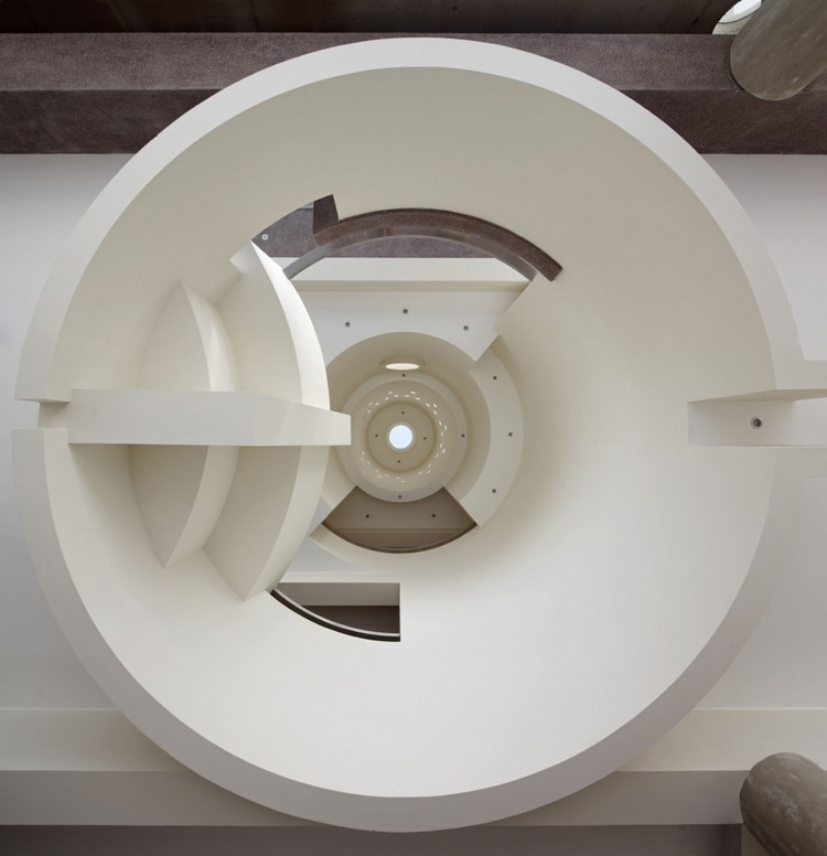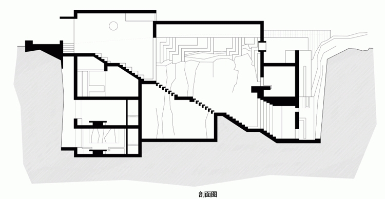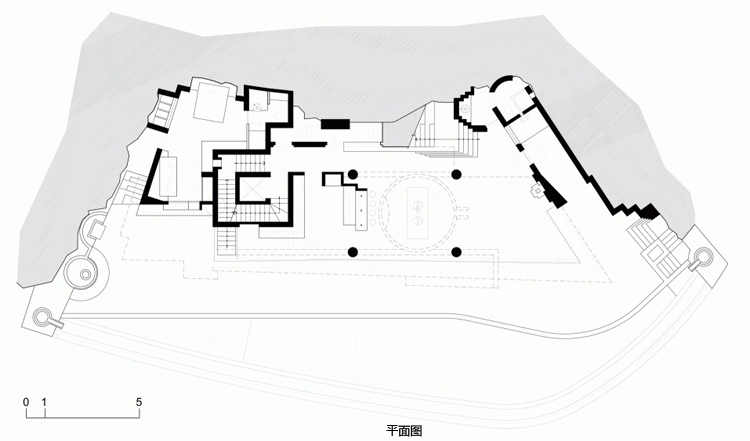 公共活動(dòng)區(qū)位于抬升的長(zhǎng)約40米的游泳池露臺(tái)上,并且被設(shè)計(jì)成如同遠(yuǎn)處小山臺(tái)地的蜿蜒曲折,后面是一扇巨大的玻璃門,人們可以在這里看到客廳、廚房等室內(nèi)情況。